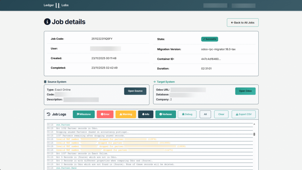 Is your accountancy firm or other business looking to switch to Odoo? Save precious time and resources through a comprehensive, automated transfer of your data from your previous accounting software. Ledger Labs transfers your accounting records in a matter of moments, cutting out the need for any manual work and preparing a reproducible go live.