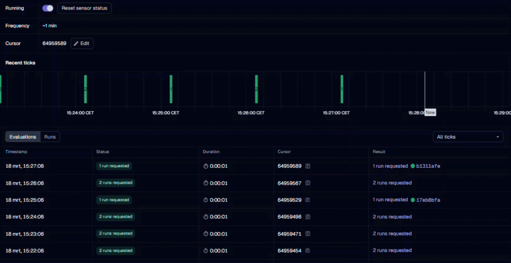 Pour cette solution, le choix a été fait d’utiliser Dagster. La fonctionnalité de capteur intégrée de Dagster s’est avérée particulièrement adaptée à la demande qui nous a été faite. Dagster est un orchestrateur de données open source, gratuit à utiliser lorsque vous gérez vous-même l’infrastructure. De plus, un portail web très intuitif est intégré, permettant d’analyser en un coup d’œil la performance des connexions.